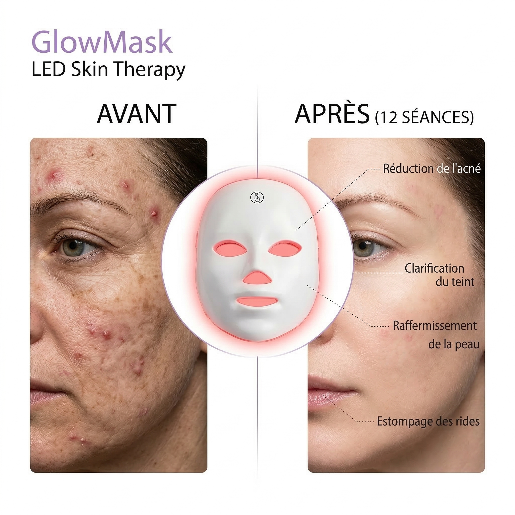 7 modes lumineux pour cibler rides, acné, éclat et fermeté en une seule séance.